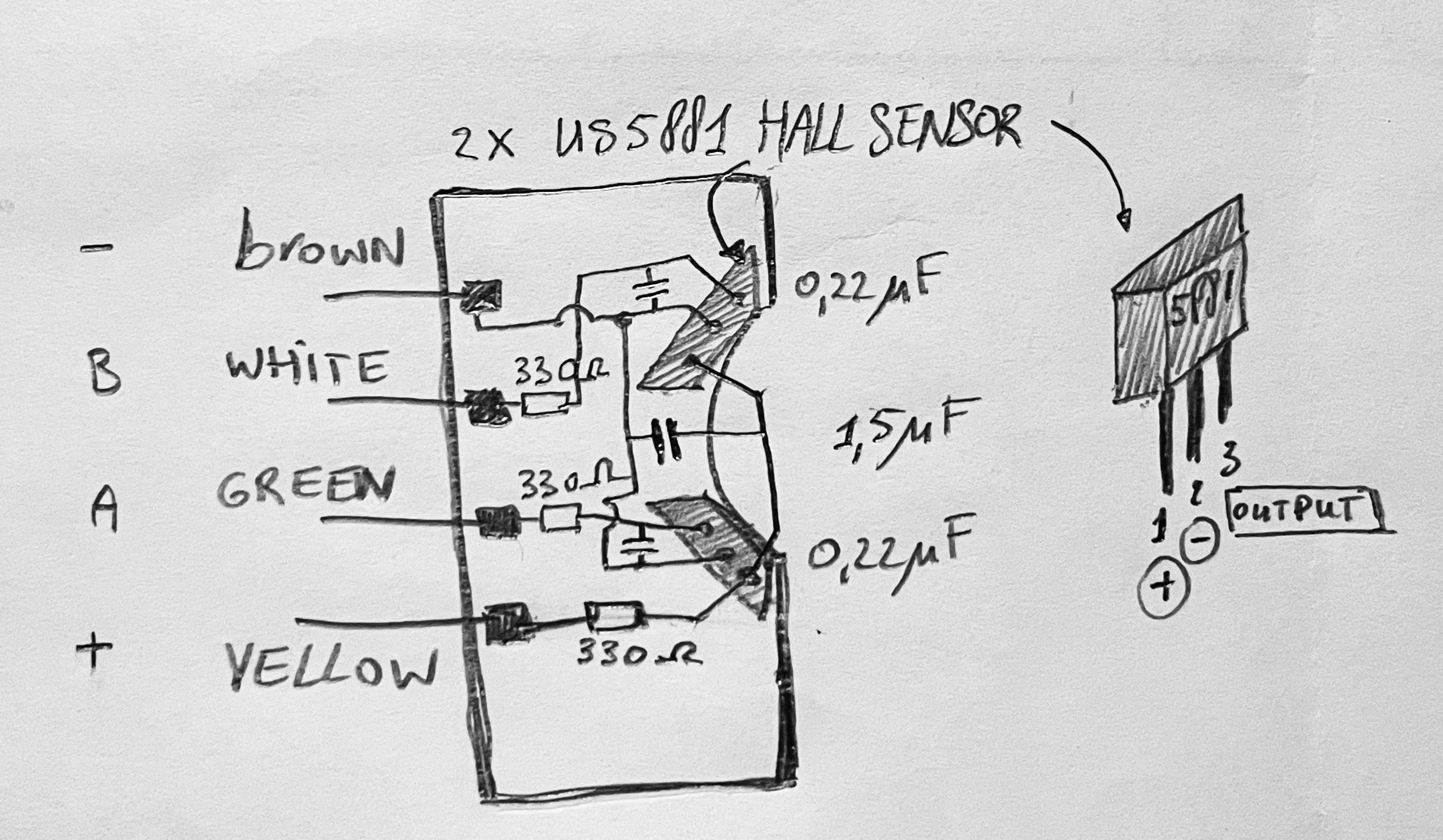 The 0.22 uF ceramic capacitors filter high frequency signals since we expect in this application lower than 50Hz signals. the 1.5uF capacitor is power supply stabilisation, in combination with the 330 Ohm series resistor between the yellow terminal and the + of the hall sensors . The 330 Ohm resistors in series to the A and B sensor terminals limit the current the sensors may draw.