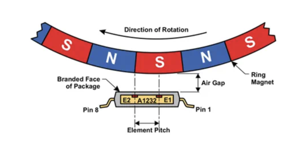 As shown in the video top right and below, the magnets in the wheel pass the two hall sensors, resulting in a specific binary signal pattern (shown below on this page) which reveals the rotation direction and speed of the wheel.